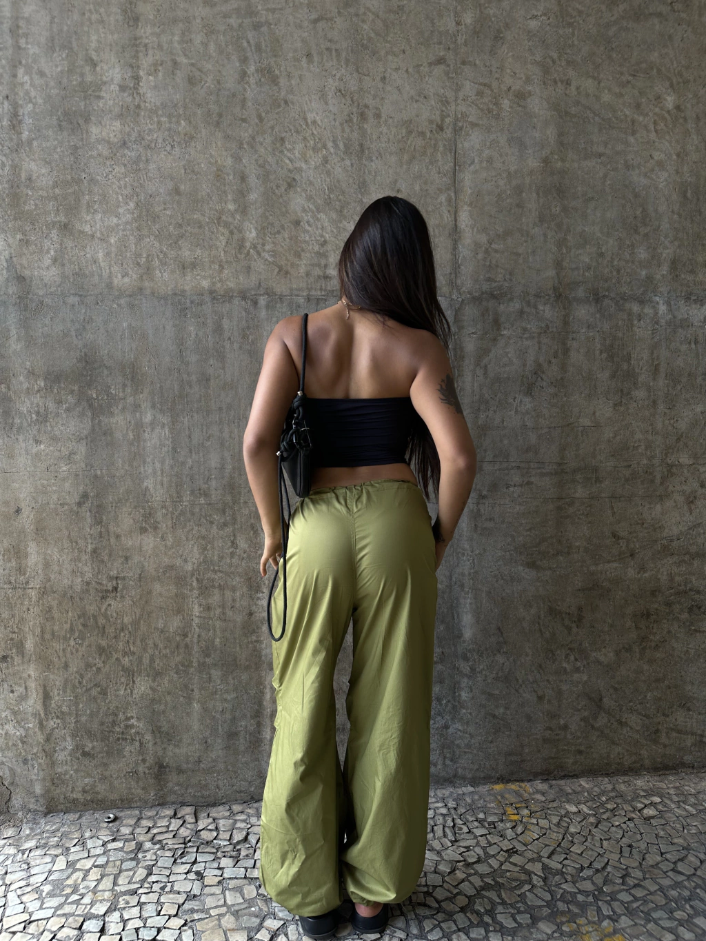 Calça parachute com elástico no cós, bolsos nas laterais e fechamento de zíper. Possui elástico na barra com ajuste, e modelagem mais larguinha no corpo.