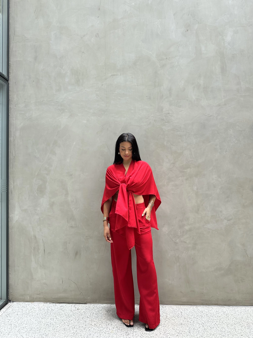 A blusa acompanha um top faixa com elástico, aumentando ainda mais as possibilidades de uso. Sua modelagem permite diversas formas de combinação, ideal para quem ama criar looks personalizados. A calça pantalona completa o conjunto com bolsos faca, forro embutido e fechamento por botão de pressão niquelado, garantindo praticidade e elegância.