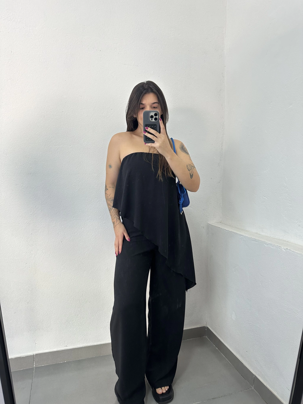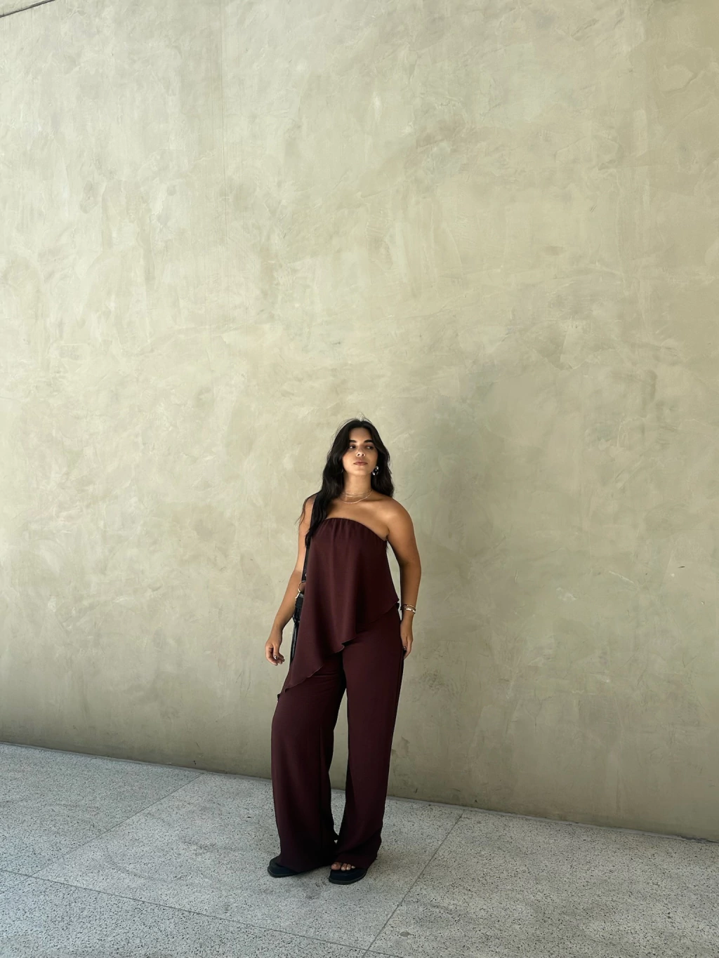 Macacão assimétrico, tomara que caia, confeccionado em crepe dunas, ele não amassa e tem um zíper nas costas que facilita a hora de vestir. O elástico no busto garante um ajuste confortável e feminino. Não possui bojo, mas pode ser usado com sutiã sem alça!