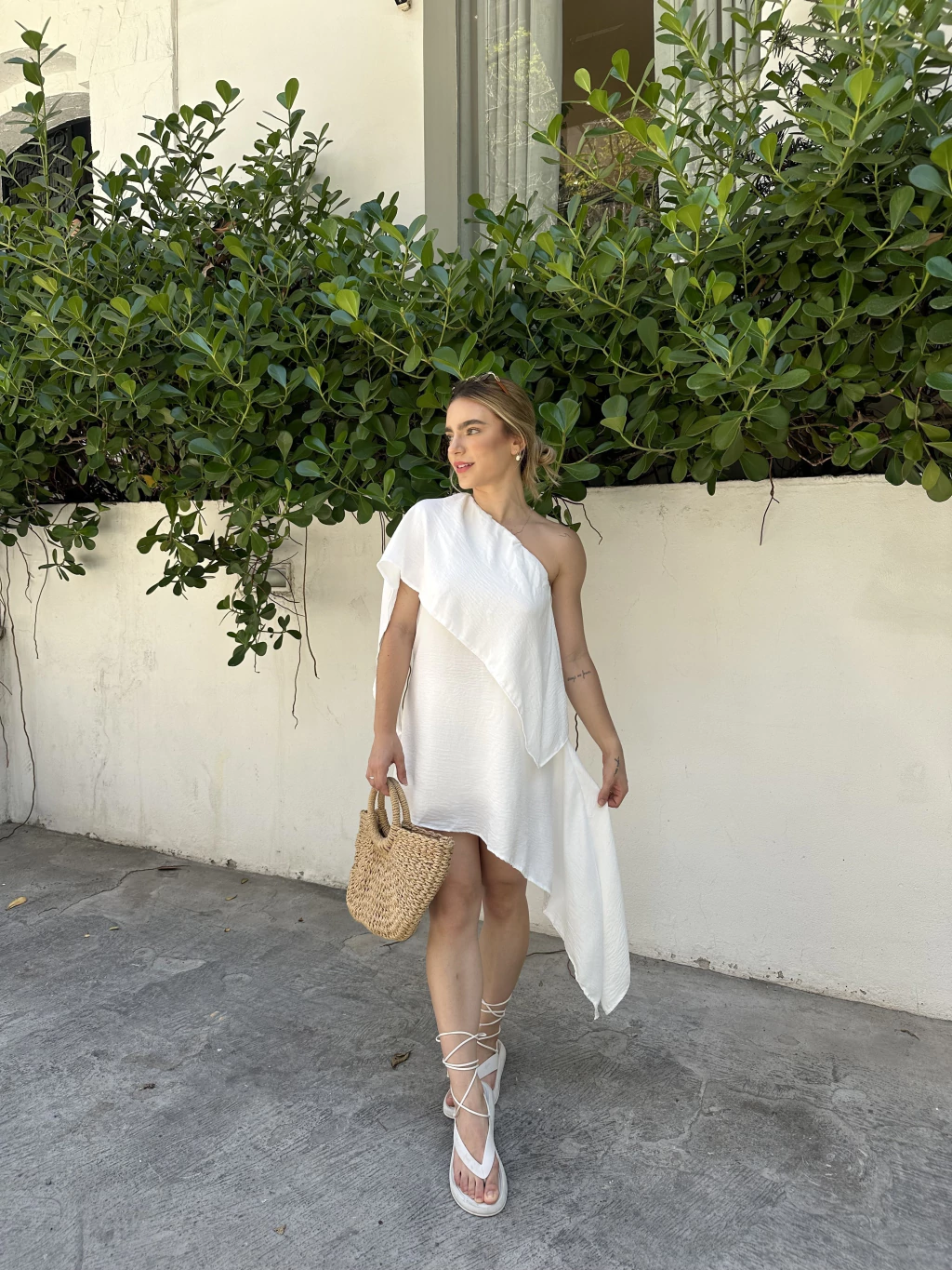 Confeccionado em crepe duna, destaca-se pelo design assimétrico com um ombro só e detalhe fluido, que confere movimento e charme ao visual.